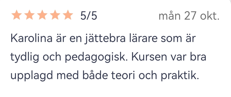 Jag har deltagit på kursen Reiki steg 2. Det var en otroligt givande kurs och jag känner mig så tacksam över att jag deltagit i den. Det var teori och praktik varvat med varandra. Karolina vägleder professionellt i meditation och övningar. Denna helg var helt magisk!